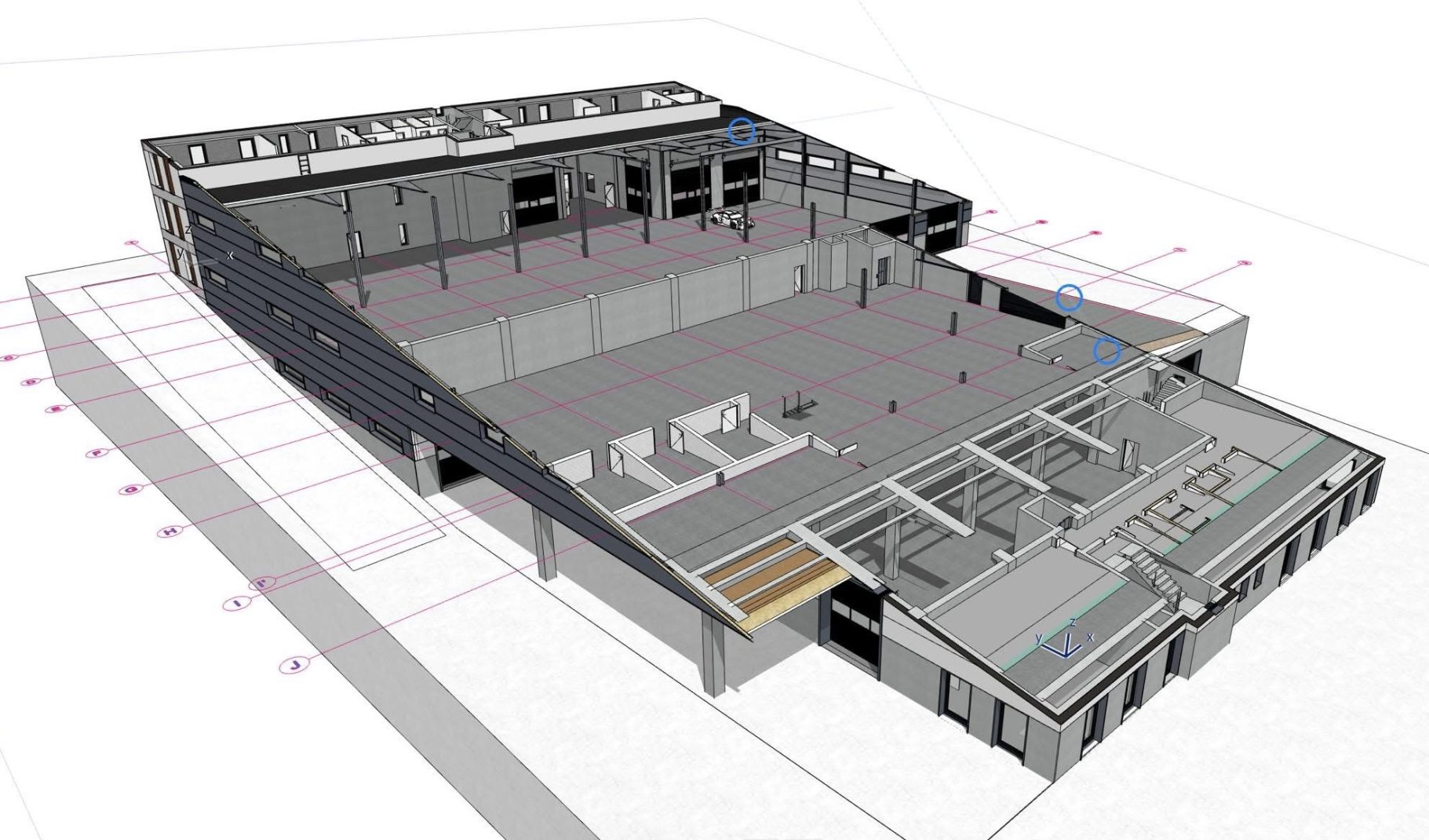 Ein weiteres aktuell laufendes Projekt umfasst den Bau eines Büro- und Zentrallagers für unseren Kunden Manthey Racing. Dieses entsteht mit ca. 7.200 qm Nutzfläche und einem BRI von 48.000 cbm im Gewerbegiebt Meuspath nahe des Nürburgrings.